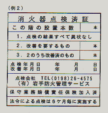 (例2)消火器点検済証の説明 6ヶ月毎の点検時に、各階の最も適当な場所に貼付する <記入例>