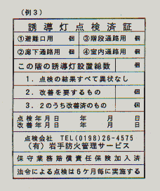 (例3)誘 導 灯 点 検 済 証の説明 6ヶ月毎の点検時に、各階の分電盤又は最も適当な場所に貼付する。 <記入例>