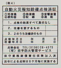 (例4)自動火災報知設備点検済証の説明 6ヶ月毎の点検時に、受信機前面の最も適当な場所に貼付する。 <記入例> (例1の消防用設備点検済証及び例3誘導灯点検済証の記入例に準ずる) |